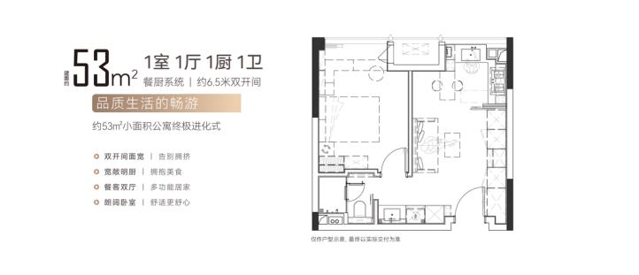 约53平的单室套,双开间大面宽,还是双厅设计,虽然面积不大,但户型方正,功能齐全。开放式的设计,空间感做的很好,装修风格也很有个性,很适合现在具有个性、对生活品质有要求的人群居住。