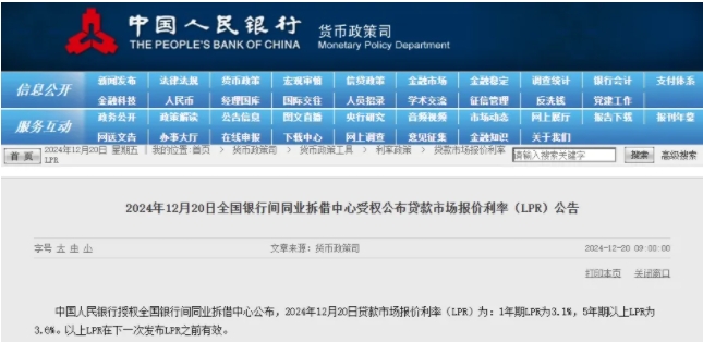 中国人民银行授权全国银行间同业拆借中心公布,2024年12月20日贷款市场报价利率(LPR)为:1年期LPR为3.1%,5年期以上LPR为3.6%,均与上月持平。