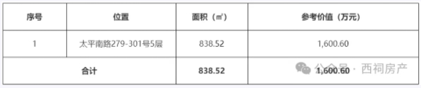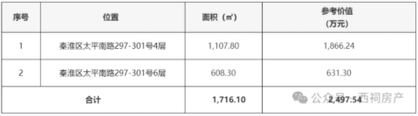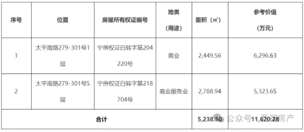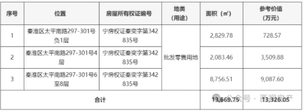 该不动产位于江苏省南京市秦淮区太平南路279-301号,包括有证房产及尚未取得产证的房产。其中有证房产面积为5,238.50㎡,土地用途为商业、商业服务业,参考价值为11,620.28万元。尚未取得产证的房产面积为838.52㎡,参考价值为1,600.60万元,参考价值合计为13,220.88万元,具体信息如下表所示: