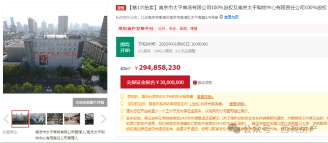 据悉,2023年6月12日,南京市中级人民法院裁定批准金盛置业投资集团有限公司等28家公司重整计划,依据重整计划资产处置方案及受金盛置业投资集团有限公司委托,管理人将于2025年1月6日10时至2025年1月7日10时止(延时除外)在京东拍卖破产强清平台进行公开拍卖活动(处置单位:南京市太平商场有限公司管理人、南京太平购物中心有限责任公司管理人;监督单位:南京市中级人民法院)。