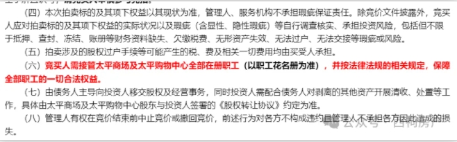 值得一提的是,本次拍卖,竞买人需接管太平商场及太平购物中心全部在册职工(以职工花名册为准),并按法律法规的相关规定,保障全部职工的一切合法权益。