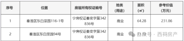 该不动产位于江苏省南京市秦淮区东白菜园116-1号,土地系划拨用地,土地及房产规划用途为商业,房产面积为64.28㎡,参考价值(定义详见下文“郑重提醒各竞买人”部分)为231.86万元,具体信息如下表所示: