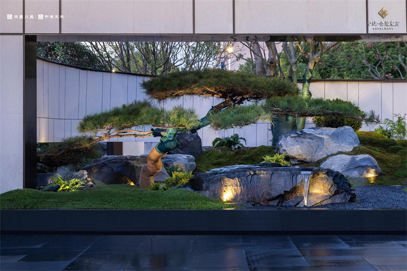 宽玻框景内,选用产自保加利亚的维纳多奢石,原石切割,左右各有五块,有“九五之尊”之意;两侧50年黑松与山西黑景石搭配,气势雄浑。