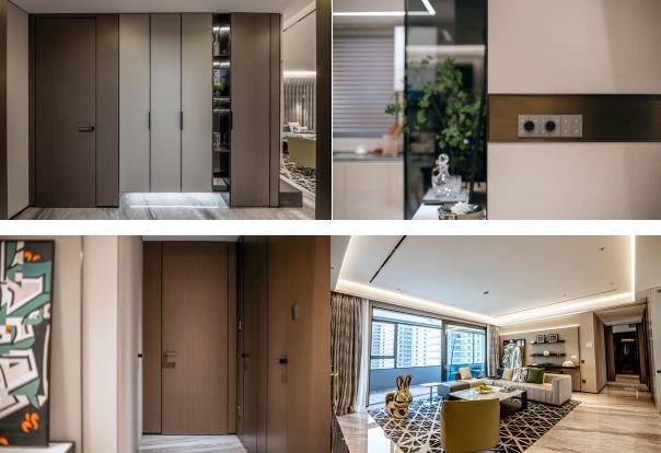 客餐厅玄关使用实心竹木纤维墙板,比墙布耐磨、耐滑、耐高温,且无甲醛。
