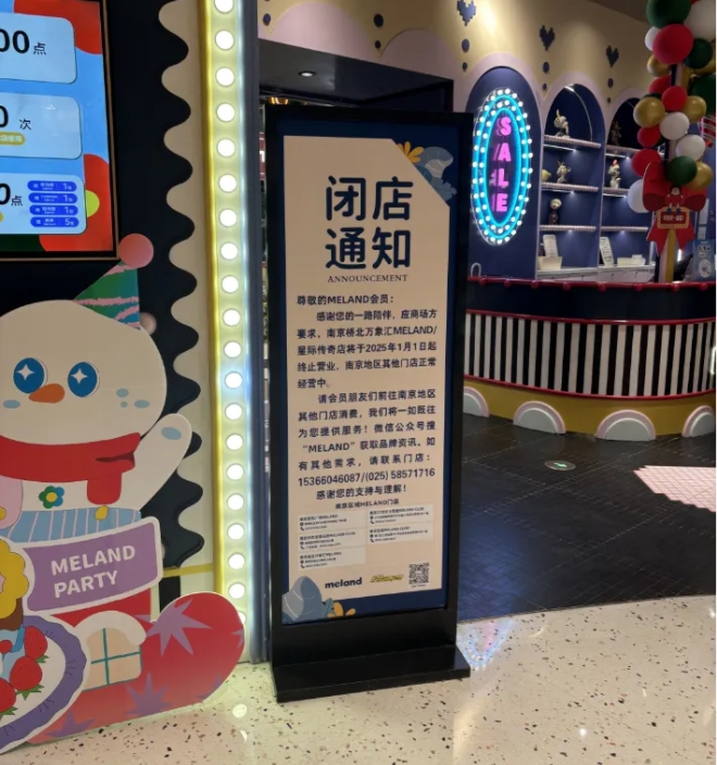 位于3楼的儿童乐园MELAND张贴了闭店通知,通知显示:南京桥北万象汇MELAND/星际传奇店将于2025年1月1日起终止营业。