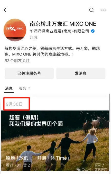 而桥北万象汇官方公众号“南京桥北万象汇MIXC ONE”的更新还停留在2024年9月30日,已经3个月没有更新。该账号的认证主体为“华润润泽商业发展(南京)有限公司”。