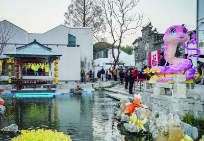 记者看到,湖区不大,400多平方米,由东南大学建筑学院团队操刀设计。湖面北侧以马头墙为背景,沿湖设亲水台阶,曲折的廊道可以直接步行至湖心亭,岸边块石堆叠,用夜灯勾勒造型。