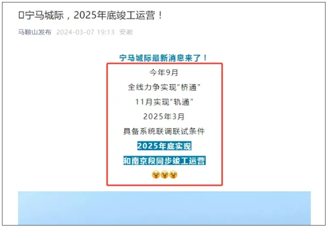 虽然部分区段受到制约,但一直以来宁马城际进展比较顺利。今年3月份,马鞍山发布曾正式公布宁马城际的几大重要节点:今年9月全线力争实现“桥通”,2025年3月具备系统联调联试条件,2025年底实现和南京段同步竣工运营。