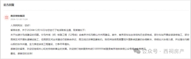 2024年12月30日,南京地铁集团表示:“关于加速宁马线建设的问题。宁马市域(郊)铁路工程(S2号线)由南京方和马鞍山方共同建设。其中,南京段车站主体结构已全部完成,部分车站开展安装装修施工,部分高架区间开展轨道铺设施工,但局部区间主体建设仍受剩余拆迁、高压线迁改等因素制约。我司将继续高度重视外围影响因素的协调解决,持续加大协调力度,并加强与马鞍山段的协作共建,全力推进该线工程建设,力争尽早通车。”