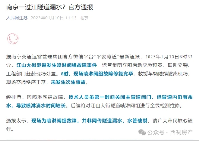 随后官方发布了通报,解释了堵车的原因:2025年1月10日6时33分,江山大街隧道发生喷淋阀组故障事件,运管集团立即启动应急预案,联动交警、工程部门赶赴现场处置,8时,现场喷淋阀组故障修复完毕,救援车辆陆续撤离现场,现场交通秩序正常,未发生次生事故。