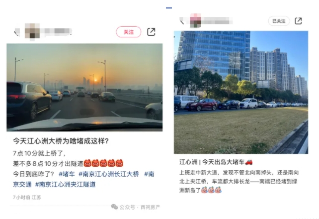 今天一早,有不少网友爆料:今天江心洲出岛大堵车。
