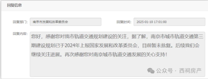 对此,西祠房产向官方咨询了南京地铁三期规划的最新进展。1月10日,南京市发展和改革委员会回复:“据了解,南京市城市轨道交通第期建设规划已于2024年上报国家发展和改革委员会,目前暂未批复。”