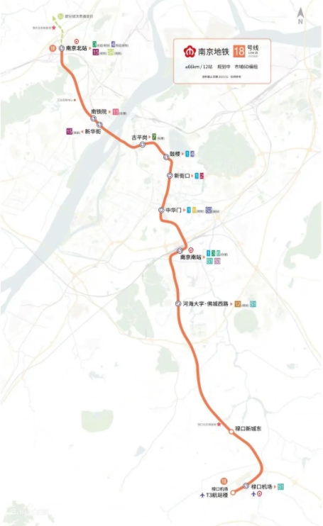 南京轨道交通18号线起自南京北站,终点禄口机场站,承担南京北站禄口机场以及新街口中心江北中心等枢纽间快速通道的功能,线路全长约65.8公里。