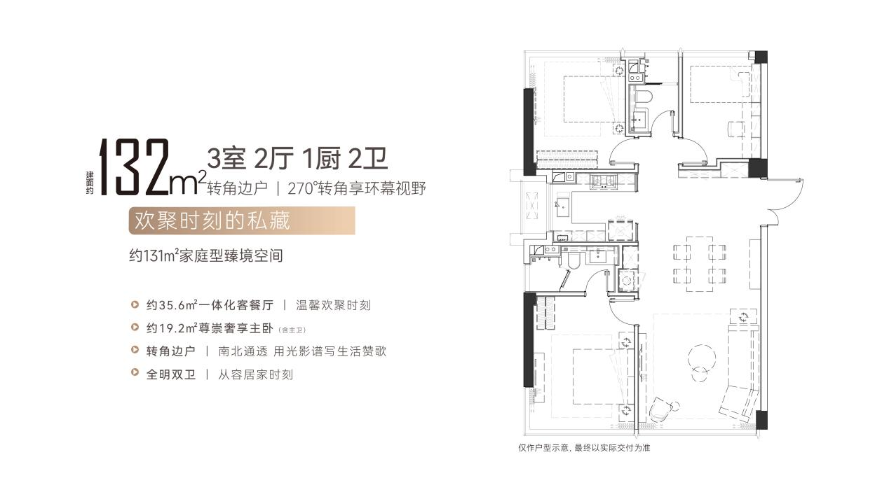采光和通风都非常好,光客餐厅面积就超18㎡,空间开阔。主卧带独立卫浴,特别是270°转角窗,现场看过,视野绝了,很难不爱。这个户型也是热度很高的一个户型,肯定是不愁卖。