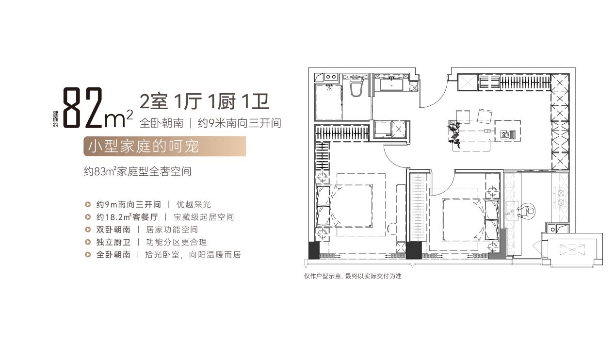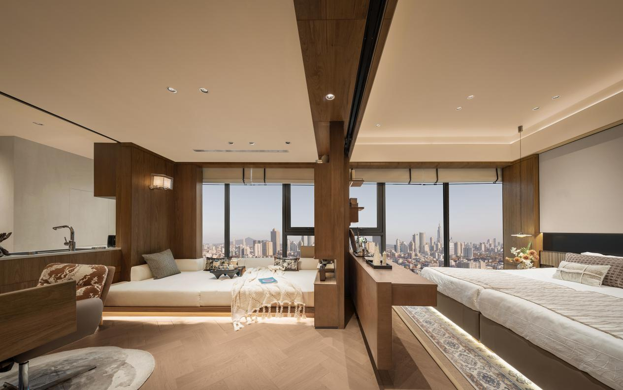 全卧朝南,还做到了南向约9米三开间,空间开阔,而且配色基调沉稳高级,整个品质感做的十分到位。