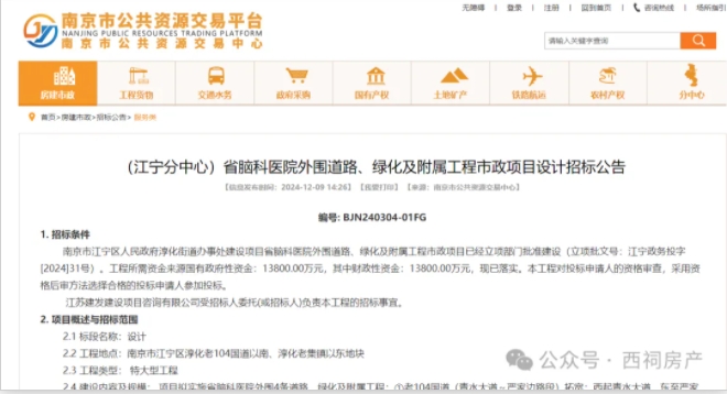 2024年12月9日,江苏省脑科医院外围道路、绿化及附属工程市政项目设计招标公告发布,据显示,南京市江宁区人民政府淳化街道办事处建设项目省脑科医院外围道路、绿化及附属工程市政项目已经立项部门批准建设(立项批文号:江宁政务投字[2024]31号)。工程所需资金来源国有政府性资金:13800.00万元,其中财政性资金:13800.00万元,现已落实。