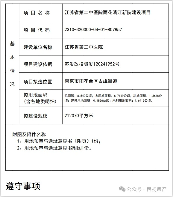 据项目用地预审与选址意见书显示,江苏省第二中医院雨花滨江新院建设项目,拟建设规模212070平方米。拟用地面积 (含各地类明细) 总面积:8.542公顷;农用地面积:6.7149公顷;耕地面积:1.3648公顷;建设用地面积:0.1856公顷;未利用地面积:1.6415公顷。