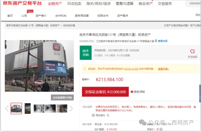 时隔一年后,位于南京新街口国美电器商场又再度法拍,本次起拍价为约2.14亿元,竞拍需缴纳保证金2200万元,加价幅度为10万元,拍卖时间为2025年3月11日10:00时起至2025年3月12日10:00 时。截至发稿前,本次拍卖有354人围观,尚无人报名。