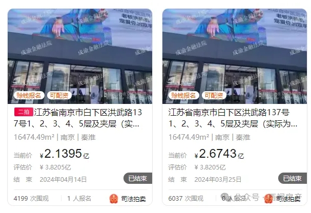 2024年,该商场上架阿里法拍,曾两度流拍,商场评估总价约3.82亿元,房产总建筑面积为16474.49平方米。>>>行业巨头倒下!新街口国美电器遭抛售!降了一个亿…