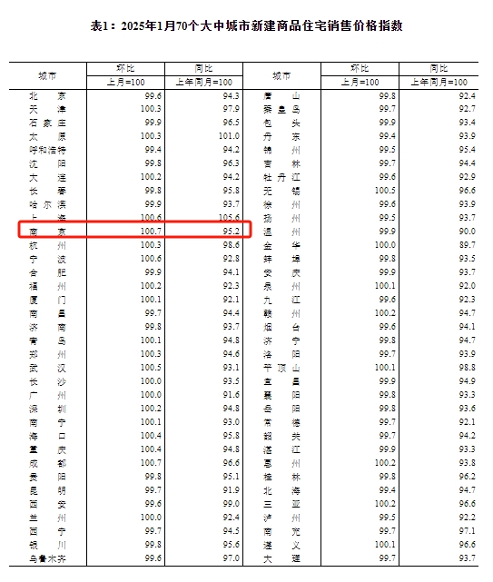 2月19日,国家统计局发布2025年1月全国70城住宅销售价格报告。1月南京新房价格环比上涨0.7%,同比下跌4.8%;二手房价格环比持平,同比下跌5.6%。