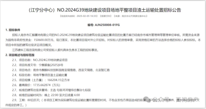 与此同时,该项目发布了场地平整项目渣土运输处置招标公告,这也以为着项目即将启动!公告显示,南京市汇麟置地有限公司的NO.2024G39地块建设项目建筑垃圾运输处置项目的处置方案已经南京市城市管理局等管理单位审核。所需资金来源为国有非政府性资金:150600.00万元,现已落实。