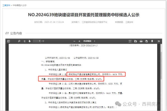 近日,据江苏省招标投标公共服务平台显示,绿城房地产建设管理集团有限公司中标NO.2024G39地块建设项目开发委托管理服务,投标报价为8679万元,服务期为974天。