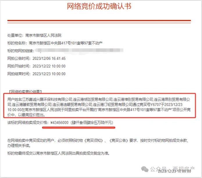 据悉,先锋奥特莱斯的产权原隶属于南京同元房地产开发有限公司。此前,开发商因与某银行有实现担保物权纠纷一案,还不上钱,导致先锋奥莱所租房产上架拍卖。2023年12月23日,先锋奥特莱斯在第8次拍卖中,被江苏嘉诚兴晟环保科技有限公司、连云港恬廷贸易有限公司等7家公司以4345.6万元竞得,对比三年前的评估价,降了近6800余万,等于打了3.9折。