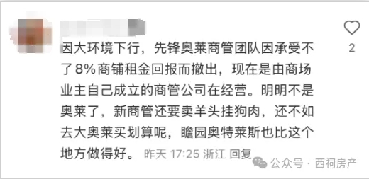 有网友爆料:“因大环境下行,先锋奥莱商管团队因承受不了8%商铺租金回报而撤出,现在是由商场业主自己成立的商管公司在经营。明明不是奥莱了,新商管还要卖羊头挂狗肉。”