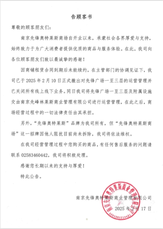 近日,南京奥特莱斯商业管理有限公司公众号“南京先锋奥莱”发表推文:已于2025年2月10日正式撤出对先锋广场一至三层的运营管理并已关闭所有线上线下业务。与此同时,已将先锋广场一至三层及附属设施交由南京先峰林莱斯商业管理有限公司进行运营管理。