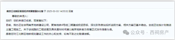 3月3日,南京江北新区枢纽经济发展管理办公室回复:“目前,我办正在会同南京地铁建设公司,聚焦地铁4号线二期建成投运目标,深化珍珠泉站后折返段方案,相关方案已基本稳定。全线正在按计划推进土建工程施工。关于该线路的工程进展及具体通车时间请以南京地铁官方微博正式发布信息为准。”