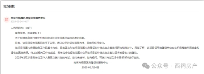 2025年2月24日,南京市栖霞区房屋征收服务中心回复:“目前,该项目征收范围已进行了公示,请以公示的征收范围为准,目前无任何变化。 该项目范围内房屋勘测工作已基本完成,目前正在对该项目范围内房屋征收补偿实施方案进行研究和商讨中。另经了解,该项目征用地建设单位也在积极筹措所需资金和征收安置房房源。待上述相关工作完成后,我单位会在征收范围内公示该项目的补偿实施方案以征求被征收人的建议。”