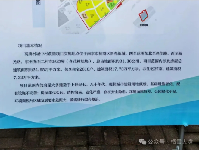 据现场张贴公告显示,高庙村城中村改造项目实施地点位于南京市栖霞区新尧新城,四至范围东北至尧佳路、西至新尧路,东至尧石二村东区边界(含花林地块),总占地面积约31.36公顷。项目范围内涉及房屋总建筑面积约24.95万平方米,包含住宅2610户、建筑面积17.73万平方米,非住宅27家、建筑面积7.22万平方米。