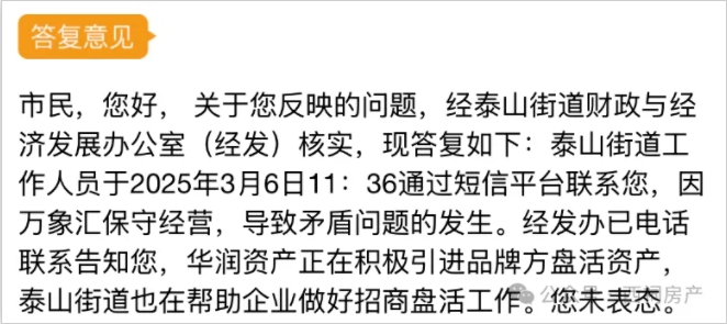 3月6日,南京江北新区泰山街道回复:“因万象汇保守经营,导致矛盾问题的发生。华润资产正在积极引进品牌方盘活资产,泰山街道也在帮助企业做好招商盘活工作。”
