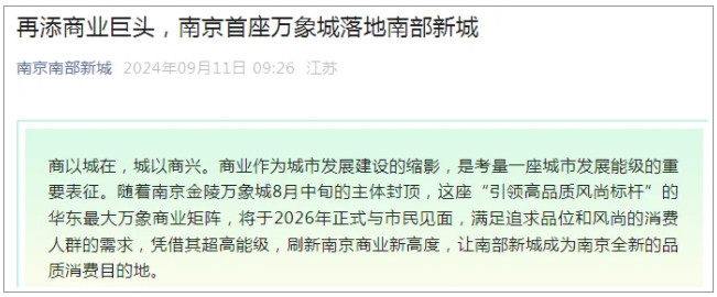 去年9月,南部新城管委会官方发布了商业巨头万象城落地南部新城的消息。这意味着不仅从官方口中确认了“万象城”的商业定位,而且还透露了南京金陵万象城的开业时间,预计就在2026年。