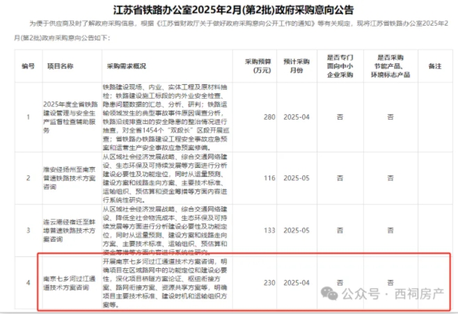 近日,江苏官网发布了“江苏省铁路办公室2025年2月(第2批)政府采购意向公告”,其中包含南京七乡河过江通道技术方案咨询的采购,采购预算为230万元,预计采购月份为2025年5月。