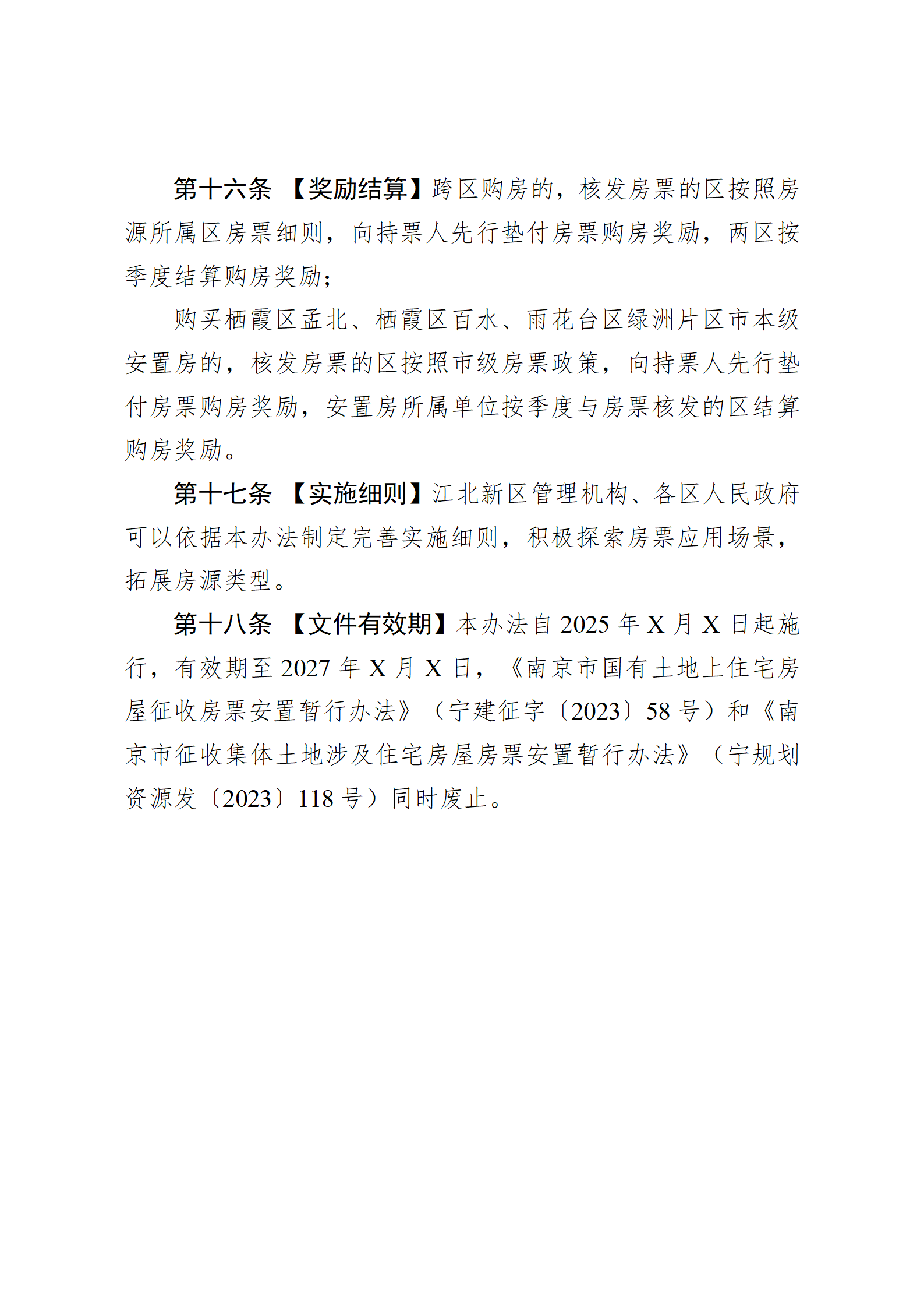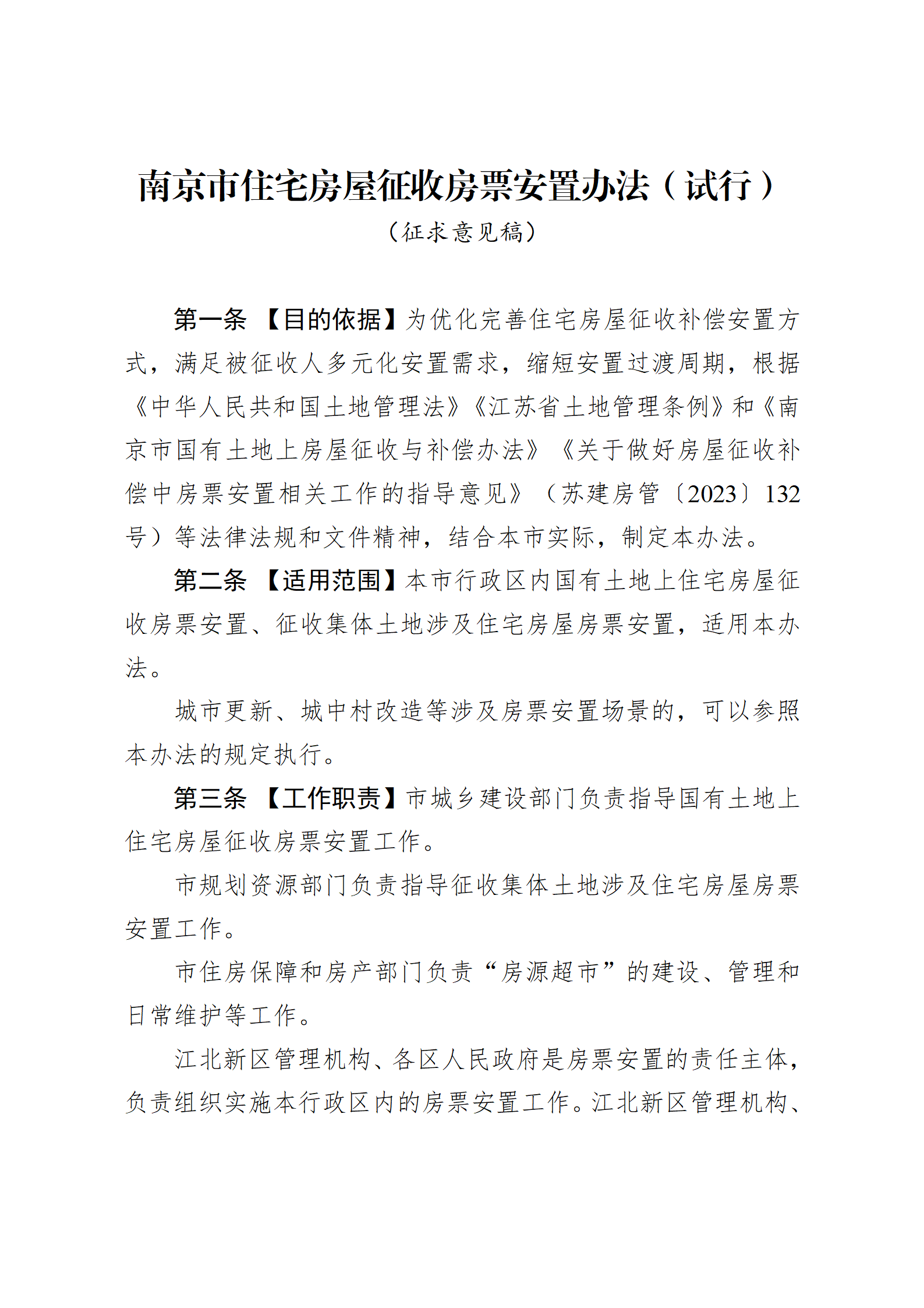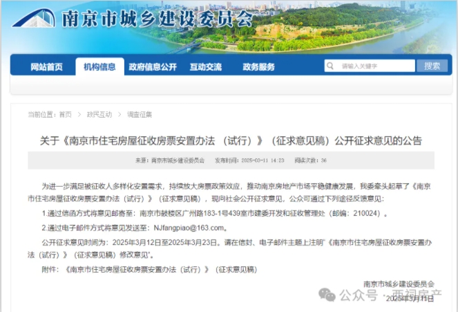 3月11日,为进一步满足被征收人多样化安置需求,持续放大房票政策效应,推动南京房地产市场平稳健康发展,南京市城乡建设委员会牵头起草了《南京市住宅房屋征收房票安置办法(试行)》(征求意见稿),现向社会公开征求意见。