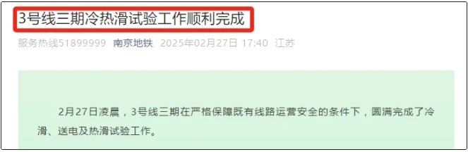 日前,南京地铁3号线三期也传来了重大进展!据南京地铁官方消息:2月27日清晨,3号线三期在严格保障既有线路运营安全的条件下,圆满完成了冷滑、送电及热滑试验工作。