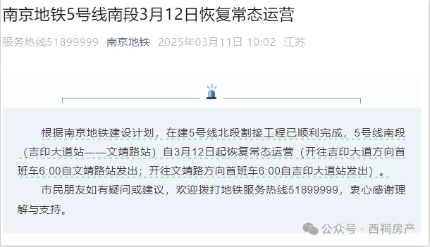 昨天上午,南京地铁官方突然发布消息:根据南京地铁建设计划,在建5号线北段割接工程已顺利完成,实际进度比原计划提前了3天!(原计划是“地铁5号线南段于2025年1月1日至3月15日临时停止运营服务,并开展全线贯通割接工程”),5号线南段(吉印大道站——文靖路站)于今日3月12日起恢复常态运营。