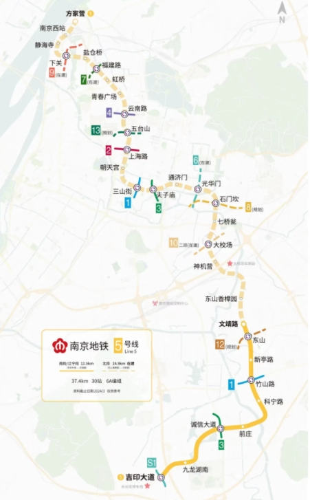 南京地铁5号线全长37.4公里,共设车站30座,全部为地下车站,于2016年底开建。其中,地铁5号线南段(吉印大道站——文靖路站)于2024年3月31日正式开通运营,共9站12.9公里。