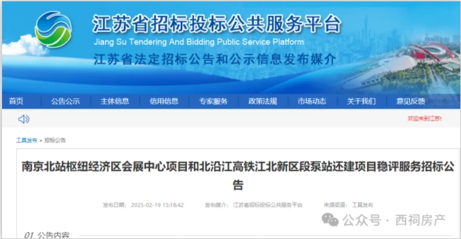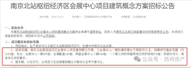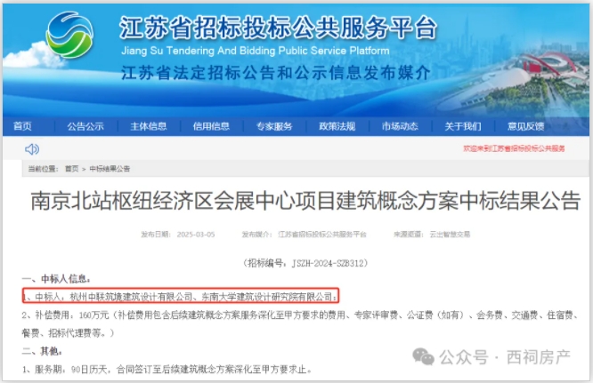 3月5日,南京北站枢纽经济区会展中心项目建筑概念方案中标结果公告,中标人为杭州中联筑境建筑设计有限公司、东南大学建筑设计研究院有限公司,服务期为90日历天。