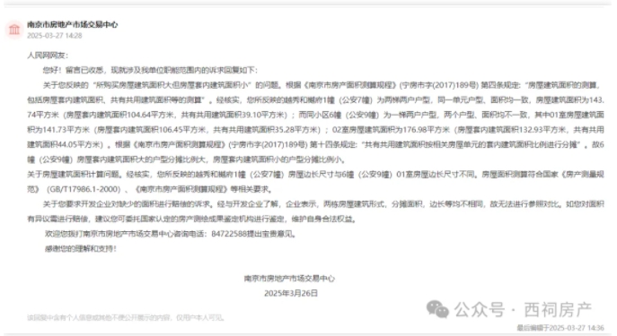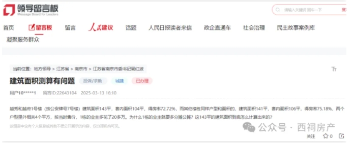 该业主在人民网领导留言板发问,越秀南京和樾府“1号楼(按公安牌号7号楼)建筑面积143㎡,套内面积104㎡,得房率72.72%,而其他楼栋同样户型面积的,建筑面积141㎡,套内面积106㎡,得房率75.18%。两个户型里外相关4个平方,按当时售价,1栋的业主多花了20多万。为什么1栋的业主就要多分摊公摊?这143㎡的建筑面积到底怎么计算出来的?”