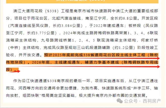 2025年1月,据南京城市建设管理集团有限公司公众号消息,预计2025年底前完成338省道雨花台区段主线主体工程(除宏伟地块段)。2026年底,主线建成通车,辅道力争基本建成(除梅钢铁路专用线段)。