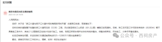 3月24日,南京市雨花台区交通运输局表示:“ 您所反映的道路属于在建的滨江大道雨花段(S338)工程,凤仪路至规划三山矶段(约1.2公里)辅路已实现通车。目前,除工农河至江宁河段宏伟地块(约380米)暂不具备施工条件外,其余2.1公里路段正在按计划进行施工。当前,我局正积极协调并加快宏伟地块整治,待整治结束后,尽快施工,力争尽早建成通车。”