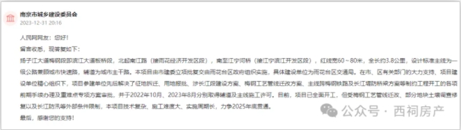 2023年12月,南京市城乡建设委员会曾表示:扬子江大道受梅钢工艺管线迁改、部分地块土壤调查修复以及长江防汛等外部条件限制,本项目技术复杂、施工难度大、实施周期长,力争2025年底贯通。