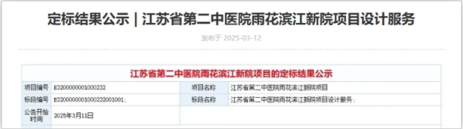 近期,江苏省公建中心发布了江苏省第二中医院雨花滨江新院项目设计服务定标结果公示。公示显示,项目拟定中标人名称为联合体:东南大学建筑设计研究院有限公司、江苏龙腾工程设计股份有限公司,投标价格为3846.6万元。这也就意味着项目施工设计招标已经尘埃落定!