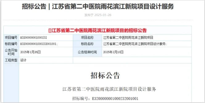 公告显示,设计服务招标工期为330天。有网友推测,施工设计需要11个月的时间,接下来还要进行施工招标,江苏省第二中医院雨花滨江新院可能要明年才能开工建设。
