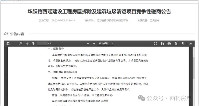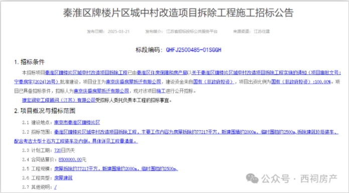 秦淮区牌楼片区城中村改造项目拆除工程,主要工作内容为房屋拆除约77217平方,新建围墙约2000m,临时围挡约2500m,拆除建筑垃圾装车、配合考古大型土石方工程装车及内倒。计划工期为720日历天。合同估算价为8500000元。