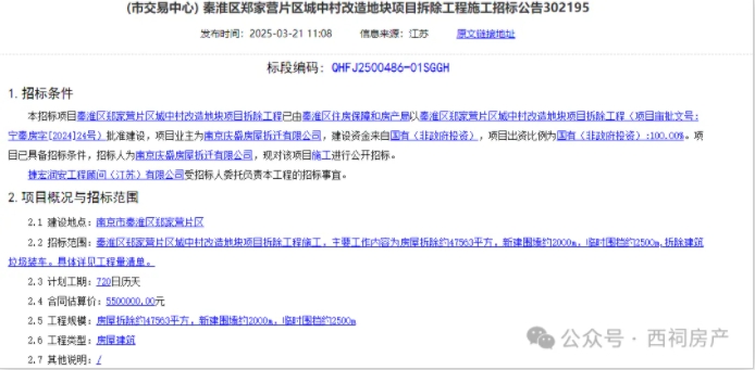 秦淮区郑家营片区城中村改造地块项目拆除工程施工,主要工作内容为房屋拆除约47563平方,新建围墙约2000m,临时围挡约2500m,拆除建筑垃圾装车。计划工期为720日历天。合同估算价为5500000元。