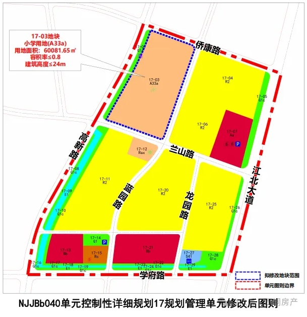 4月2日,南京江北新区官网发布了“南京江北新区NJJBb040单元控制性详细规划16、17规划管理单元图则修改公众意见征询稿”,据显示,江北高新新增一幅2.8公顷宅地,容积率为1.8。