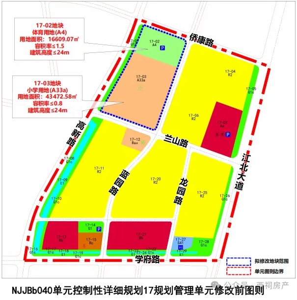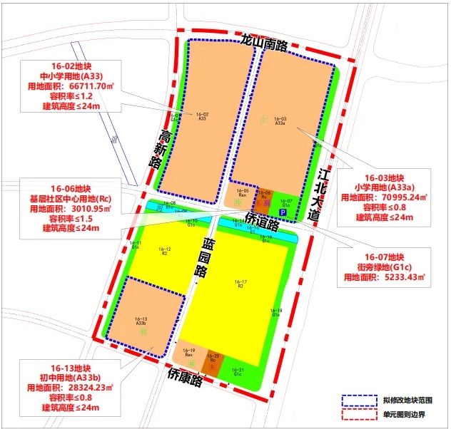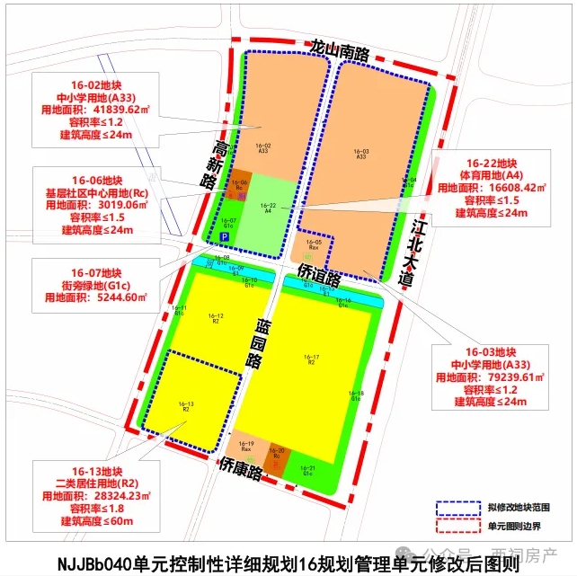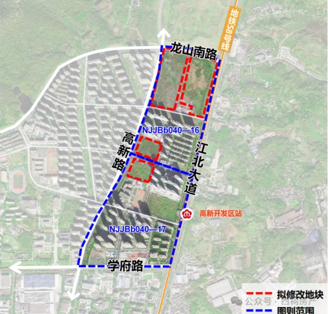 本次拟修改地块所在的NJJBb040-16、17规划管理单元,东至江北大道,南至学府路,西至高新路,北至龙山南路,总面积约90.6公顷。